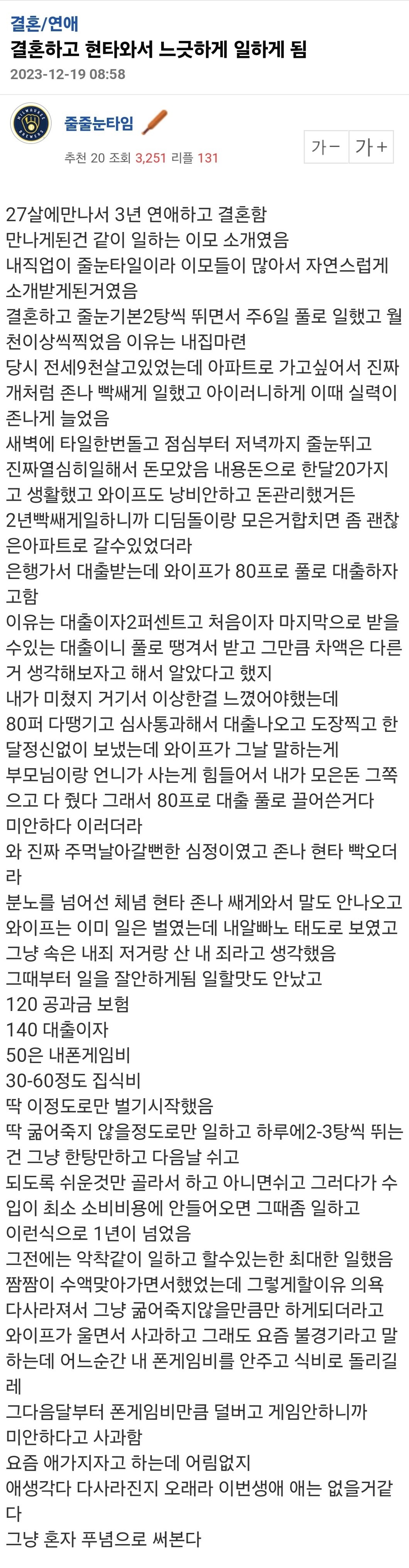 노가다해서 월 1000버는데 와이프한테 통수 맞음